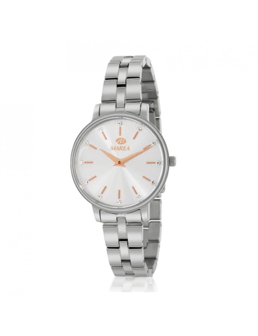 Reloj Marea Mujer B54191/1, caja de 34mm de diámetro y pulsera de acero. Reloj analógico con dos agujas, y esfera de cristal. Movimiento japonés con esfera color blanco. Es sumergible a 3ATM (no es apto para ducha o baño, sólo admite leves salpicaduras). Garantía de dos años contra defectos de fabricación.