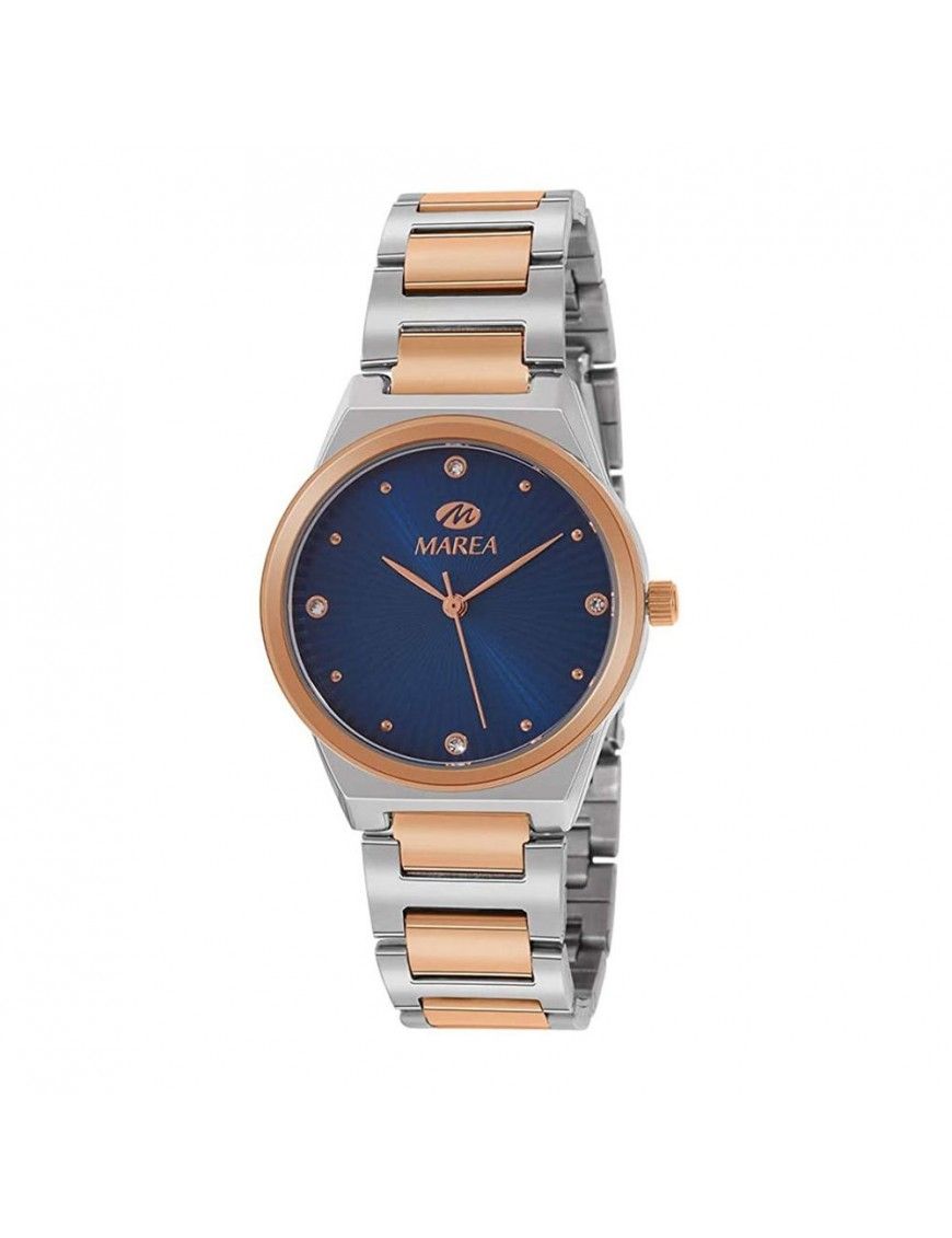 Reloj Marea Mujer B41280/3, analógico con segundero.Esfera azul de 32mm de diámetro decorada en su interior con circonitas. Agujas e indicadores en color cobrizo. Pulsera de acero bicolor (plateado y rosado). Bisel cobrizo. Cristal mineral. Sumergible a 3ATM, por lo que sólo soporta pequeñas salpicaduras.