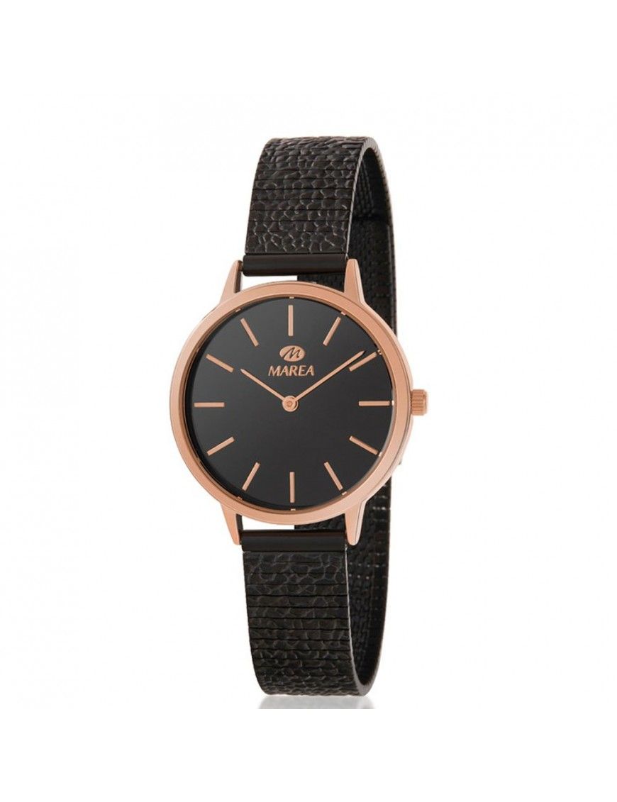 Reloj Marea Mujer B41279/4, analógico sin segundero. Esfera negra de 32mm de diámetro, agujas e indicadores en color cobrizo. Pulsera de acero en color negro. Sumergible a 3ATM, por lo que sólo soporta pequeñas salpicaduras.