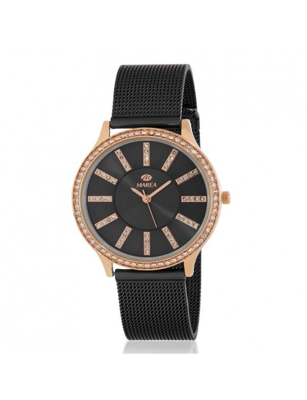 Reloj Marea Mujer B41265/3, analógico con segundero. Caja de metal de 38mm de diámetro. Bisel e indicadores decorados con circonitas. Pulsera tipo milanesa. Cristal mineral. Sumergible a 5ATM, por lo que es apto para ducha y baño sin inmersión.