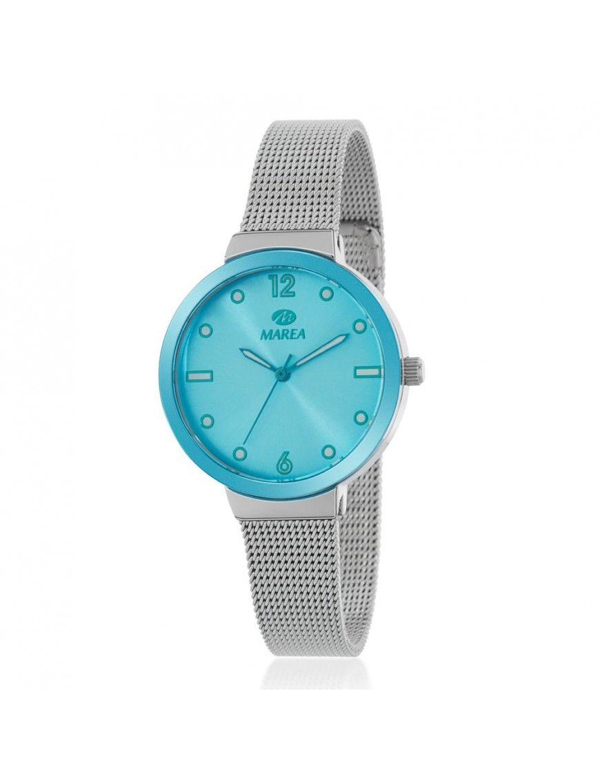 Reloj Marea Mujer B41288/1, analógico sin segundero. Caja de metal de 34mm de diámetro. Pulsera de acero tipo milanesa. Cristal mineral. Sumergible a 3ATM, por lo que sólo soporta pequeñas salpicaduras.