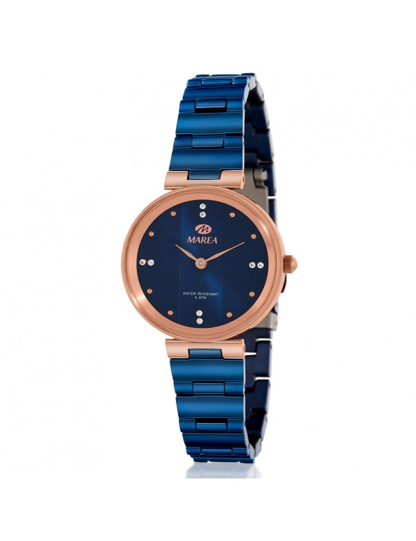 Reloj Marea Mujer B54202/3, analógico. Caja de acero bañado en color cobrizo. Diámetro de 30mm. Esfera decorada con circonitas en su interior. Pulsera de acero bañado en color azul.