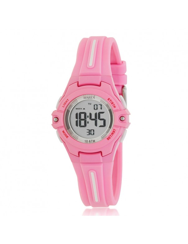 Reloj Marea Infantil B25164/3, digital. Caja de plástico de 30mm. Pantalla LCD. Función de alarma, cronómetro, formato 12/24horas y cuenta regresiva. Pulsera de silicona. Sumergible a 10ATM, por lo que es apto para ducha y baño con inmersión.