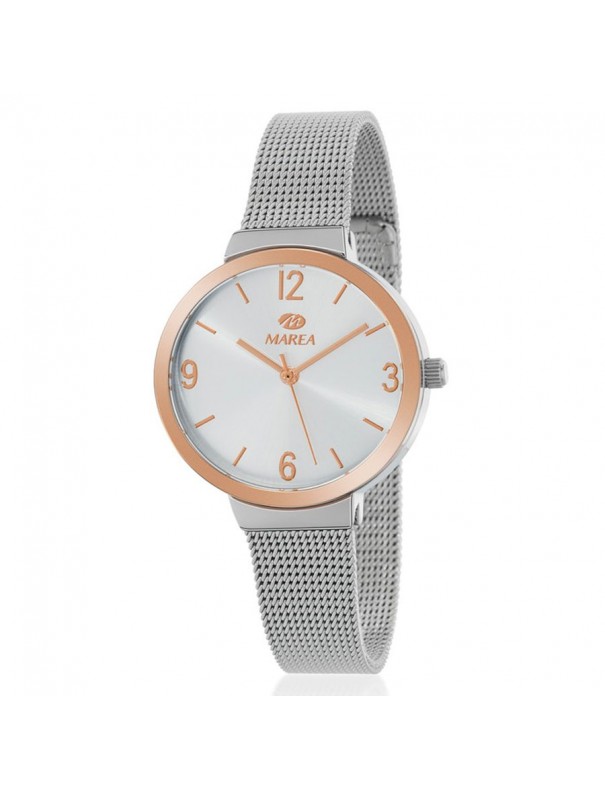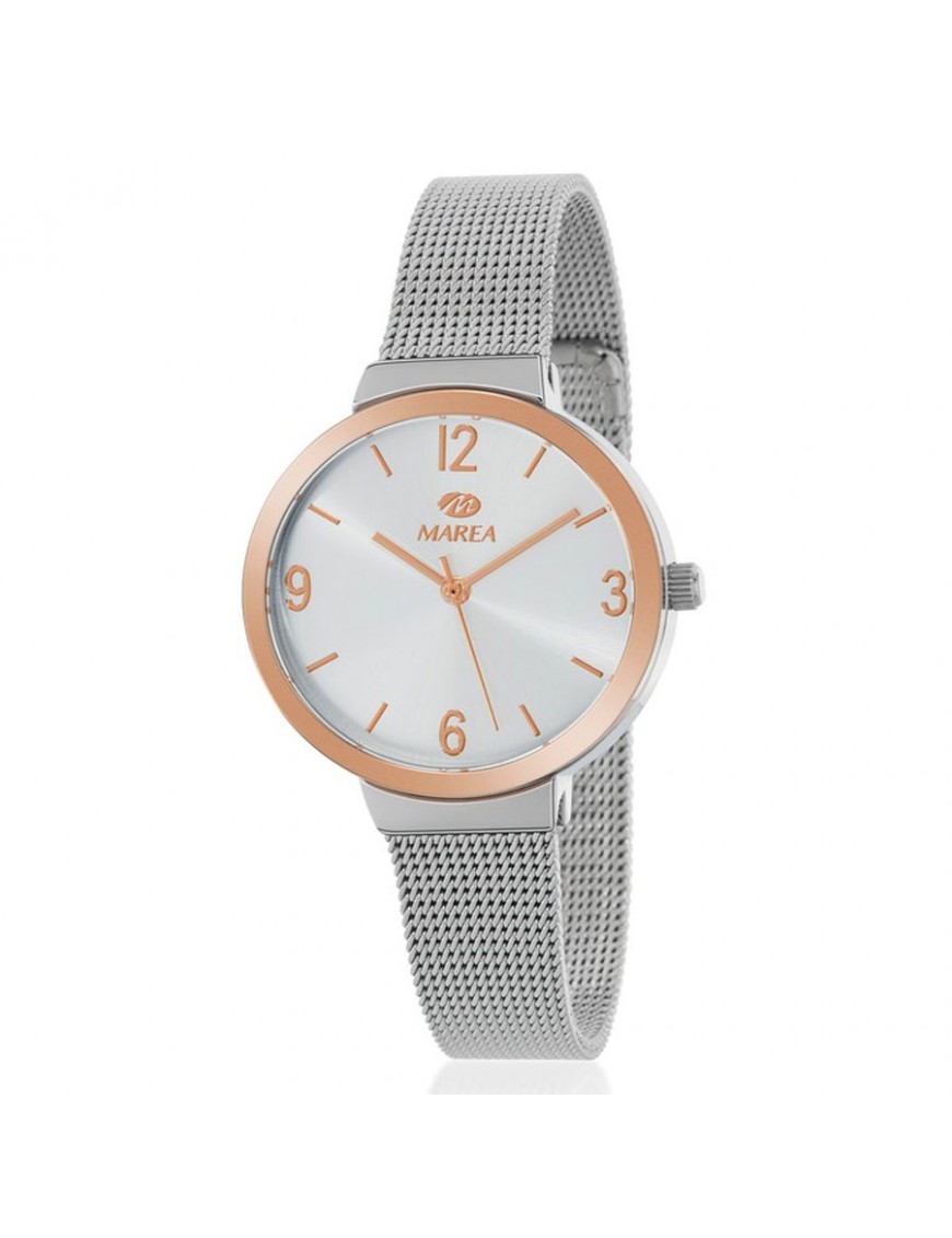 Reloj Marea para mujer B41288/9. La esfera es de metal hipoalergénico y mide 34 mm de diámetro. La pulsera es de acero. No es sumergible (3ATM) y sólo admite leves salpicaduras. Garantía de tres años.