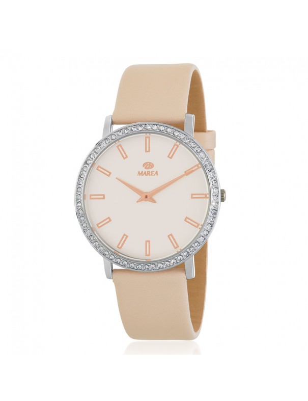Reloj Marea para mujer B41352/1. La caja es de metal plateado con circonitas y cristal mineral y mide 40 mm de diámetro. La pulsera es de piel con hebilla. No es sumergible (3ATM) y tiene tres años de garantía.