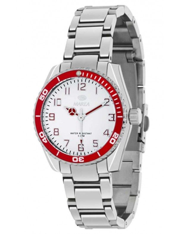 Reloj Marea Cadete B54043/3. Reloj para niños realizado en metal plateado, su esfera es redonda y blanca con detalles en color rojo. El diámetro del reloj mide 36 mm y tiene una sumergibilidad de 3 ATM. La garantía de este producto es de 2 años.
