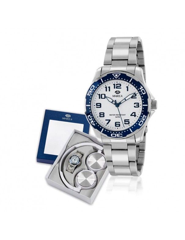 Reloj Marea Niño + Auriculares B35337/3, analógico. Caja de 36mm de diámetro. Pulsera de acero y cristal mineral. Agujas luminiscentes. Sumergible a 5ATM, por lo que es apto para ducha y baño sin inmersión. Auriculares inalámbricos de regalo.