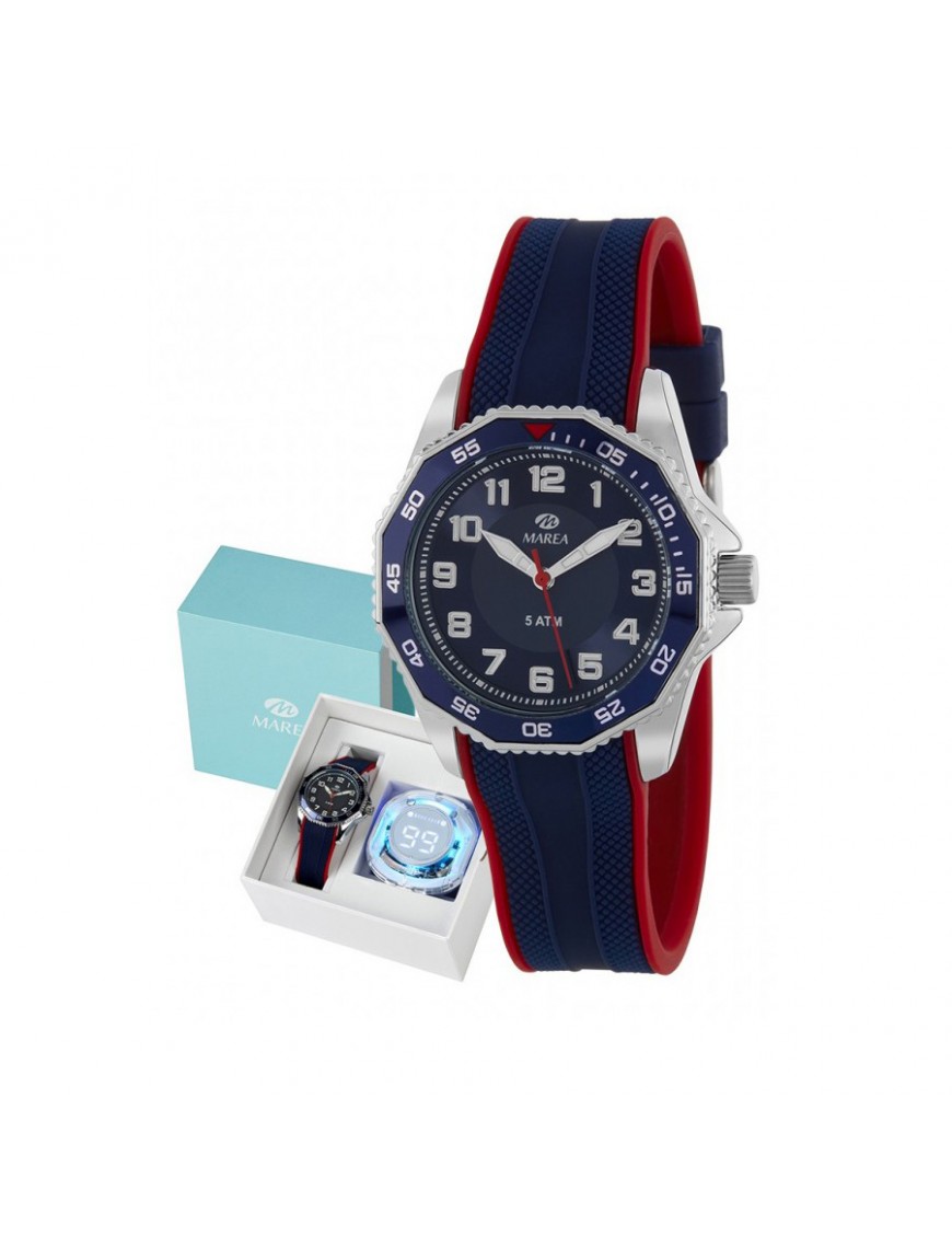 Reloj Marea Niño Comunión B35361/12. Caja plateada de acero con esfera y bisel en color azul marino. La correa de caucho combina los colores rojo y azul y tiene cierre de hebilla. Incluye cascos inalámbricos de regalo. Sumergible hasta 5 ATM. Garantía de 3 años.
