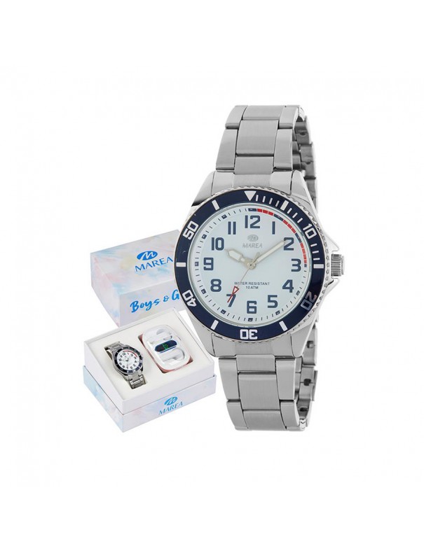 Reloj Marea Comunión Niño B41361/1. Caja de metal antialérgico de 36 mm de diámetro con bisel azul y esfera en color blanco. La correa es de acero formada por eslabones y cierre desplegable. Incluye auriculares Bluetooth de regalo. Sumergible hasta 10 ATM. Garantía de 3 años.