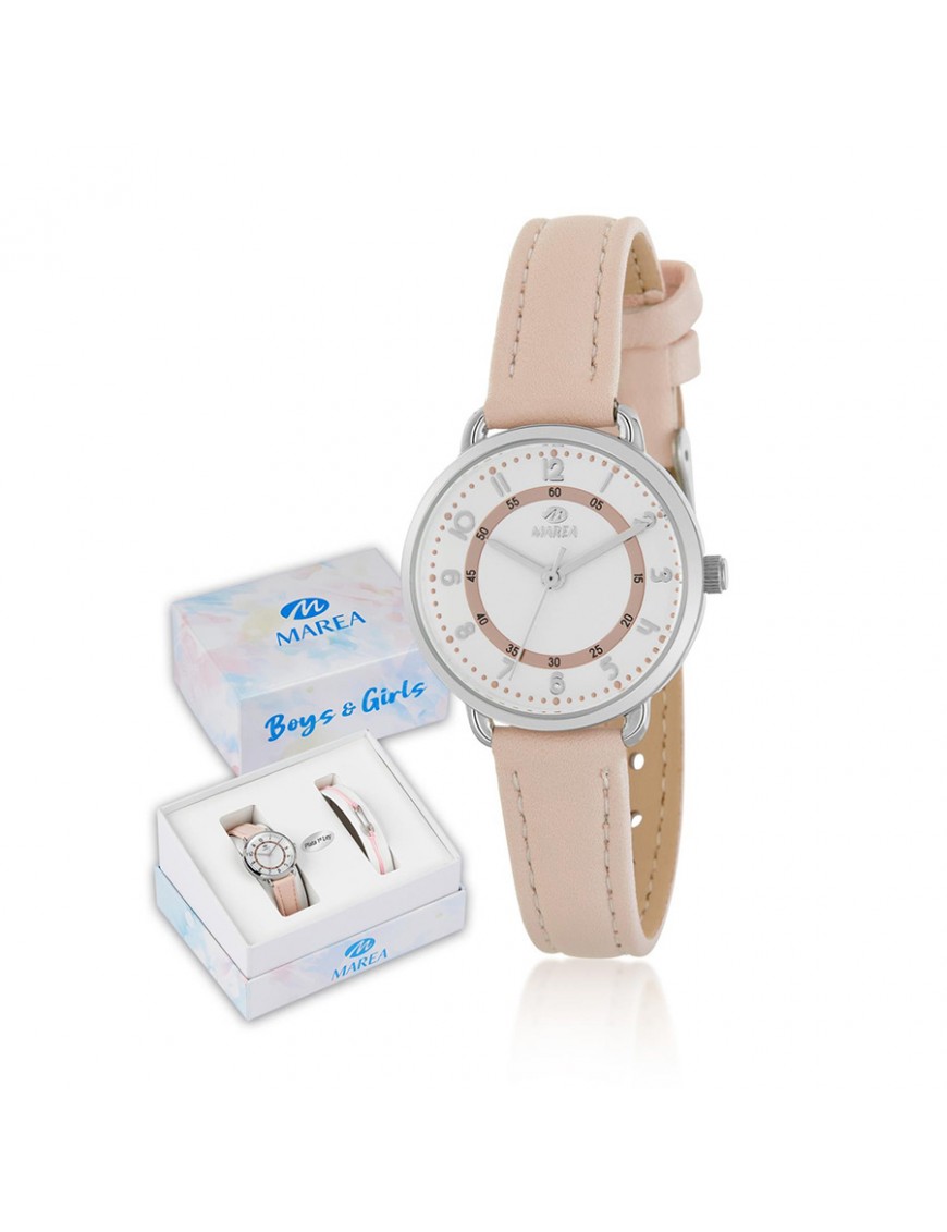 Reloj Marea Comunión Niña B41363/2. Caja de metal antialérgico de 28mm de diámetro con esfera en color blanco y detalle en rosa. La correa es de piel en color nude con pespuntes en color blanco, tiene cierre de hebilla. Incluye auriculares Bluetooth de regalo. Sumergible hasta 3 ATM. Garantía de 3 años.