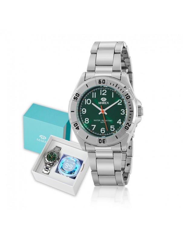 Reloj Marea Comunión Niño B41399/4. Caja de metal antialérgico de 36 mm de diámetro con bisel plateado y esfera en color verde. La correa es de acero formada por eslabones y cierre desplegable. Incluye auriculares Bluetooth de regalo. Sumergible hasta 5 ATM. Garantía de 3 años.
