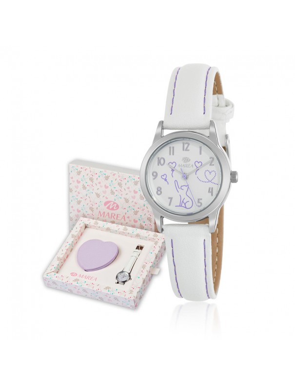 Reloj Marea Comunión Niña B41400/2. Caja de metal antialérgico de 27mm de diámetro con esfera en color blanco y dibujo de gato en color lila. La correa es de piel en color blanco con pespuntes en color rosa, tiene cierre de hebilla. Incluye un monedero lila en forma de corazón de regalo.