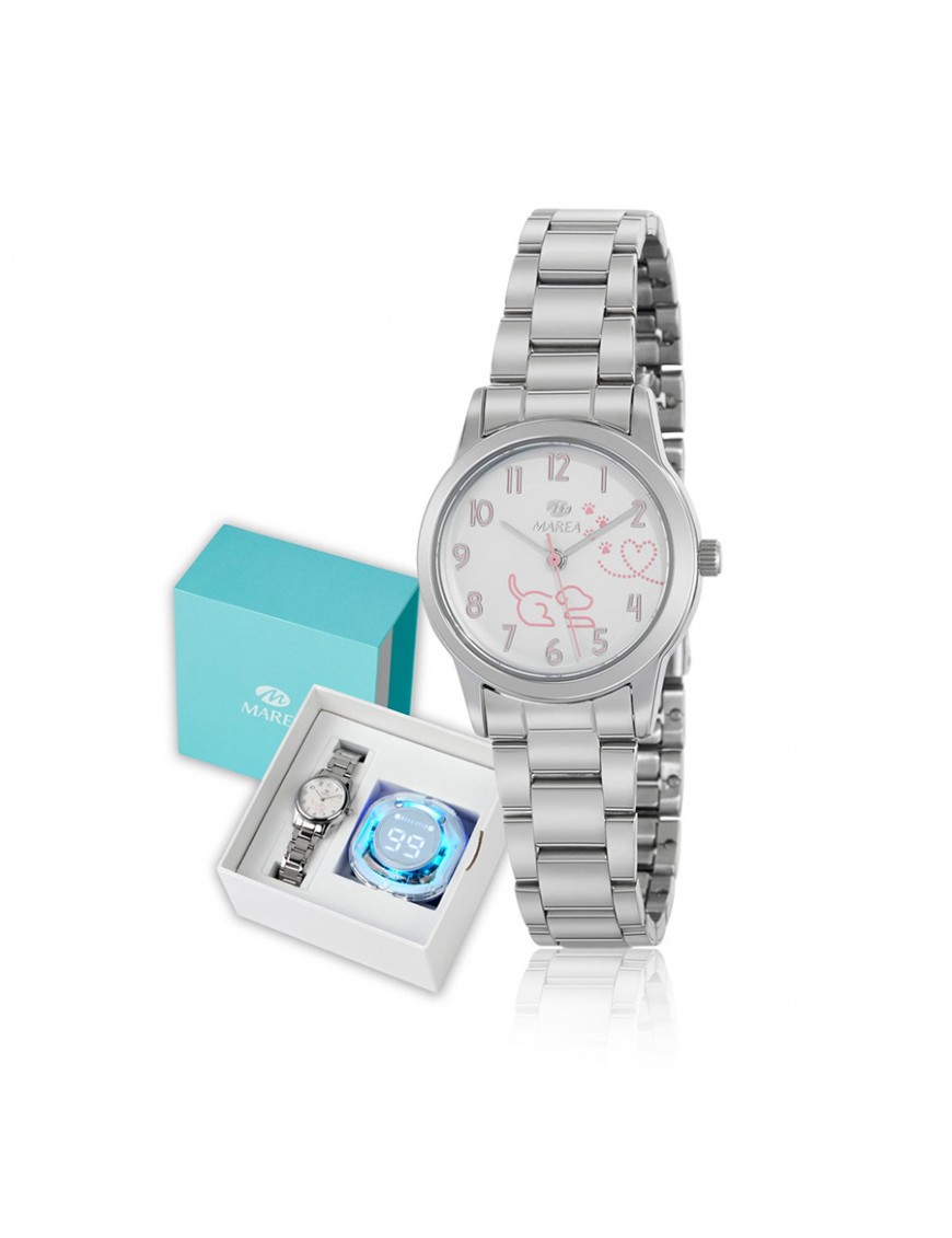 Reloj Marea Comunión Niña B41401/1. Caja de metal antialérgico de 27 mm de diámetro con bisel plateado y esfera en color blanco con dibujo lineal de perro en color rosa. La correa es de acero formada por eslabones y cierre desplegable. Incluye auriculares Bluetooth de regalo.