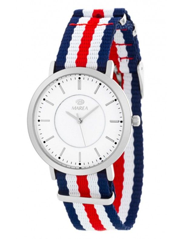 Reloj Marea unisex B21164/5. Esfera redonda de color blanca. Correa de tela en color blanca, roja y azul. Diámetro del reloj 41mm. Sumergible a 3 ATM. Garantía 2 años.