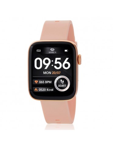 Reloj Marea Smart B57009/2. Caja de plástico de 38X40mm. Pantalla Full Touch de 1,69 pulgadas. Pulsera de caucho. Función de cronómetro, alarma, recordatorio de sedentarismo, hidratación, contador de pasos, contador de calorías consumidas, monitorización del sueño, frecuencia cardíaca, medición de presión arterial y oxígeno en sangre, notificación de llamadas y mensajes, control remoto de música y fotos, tiempo meteorológico, personalización de pantalla...