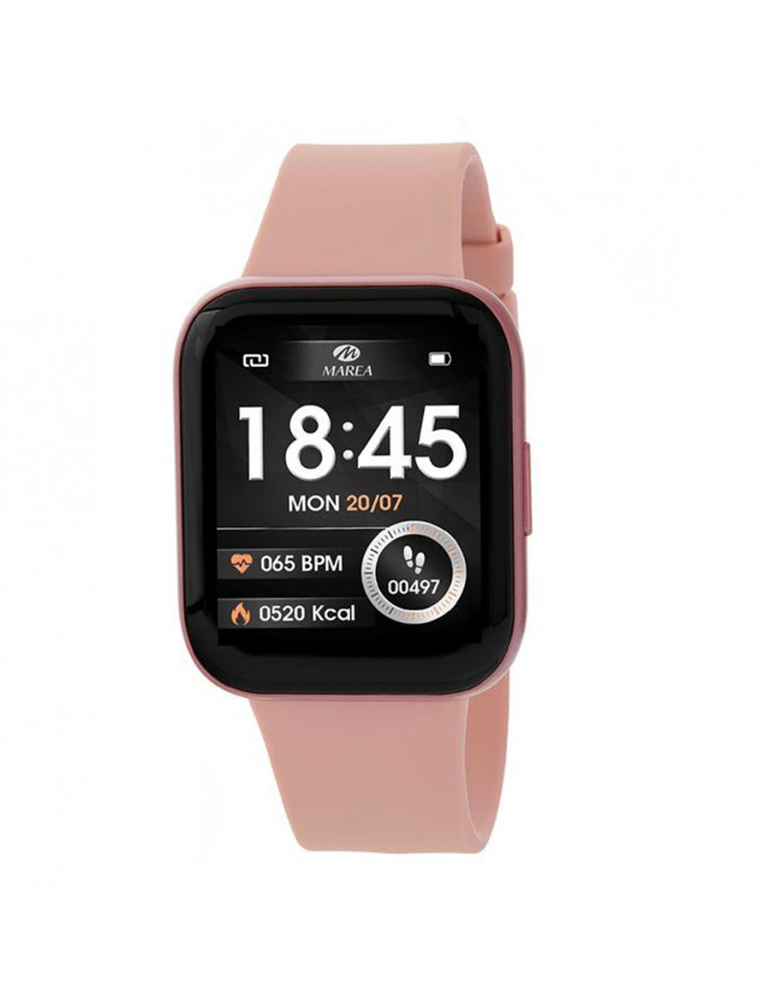 Reloj Marea Smart B57013/2. Caja de plástico de 37x45mm. Pantalla Full Touch de 1,69 pulgadas. Pulsera de caucho. Función de cronómetro, alarma, recordatorio de sedentarismo, hidratación, contador de pasos, contador de calorías consumidas, monitorización del sueño, frecuencia cardíaca, medición de presión arterial y oxígeno en sangre, electrocardiograma, notificación de llamadas y mensajes, control remoto de música y fotos, tiempo meteorológico, personalización de pantalla y videojuegos. Protección Ip68. Batería de 200mAh.