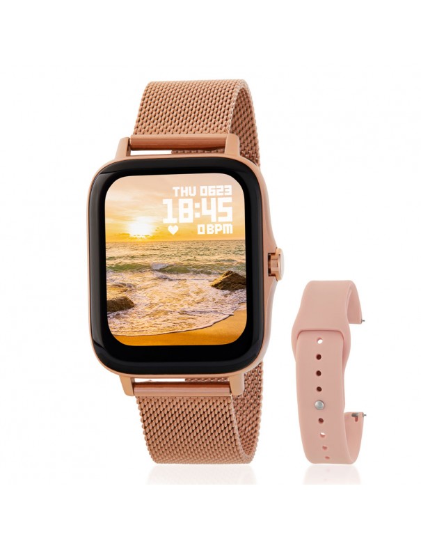 Reloj Marea Smart B57013/2. Caja de plástico de 37x45mm. Pantalla Full Touch de 1,69 pulgadas. Pulsera de caucho. Función de cronómetro, alarma, recordatorio de sedentarismo, hidratación, contador de pasos, contador de calorías consumidas, monitorización del sueño, frecuencia cardíaca, medición de presión arterial y oxígeno en sangre, electrocardiograma, notificación de llamadas y mensajes, control remoto de música y fotos, tiempo meteorológico, personalización de pantalla y videojuegos. Protección Ip68. Batería de 20mAh.