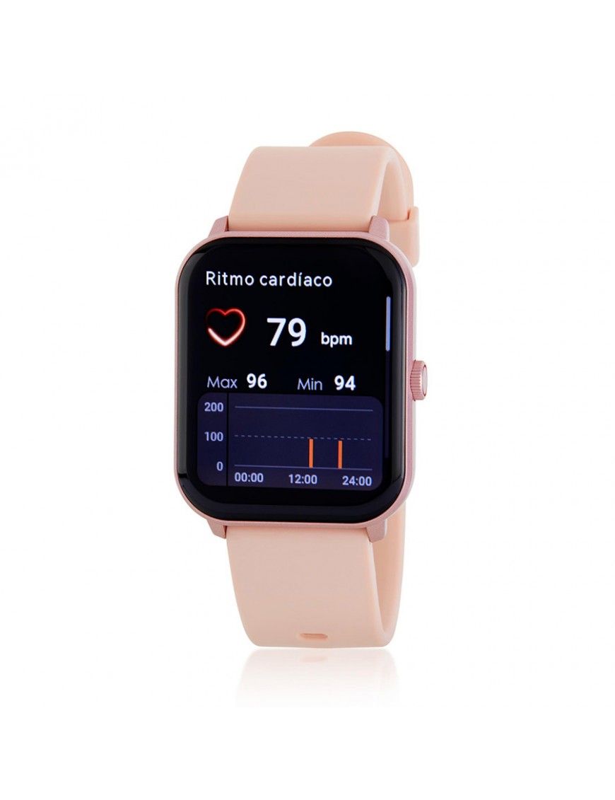 Reloj Marea Smart Mujer B59009/3. Caja rectangular de resina de 44 mm de diámetro con correa de silicona en color rosa. Funciones: notificaciones, control de pasos, control remoto de música, cronógrafo, temporizador, alarma, presión sanguínea, modo deporte, contado de pasos, calorías y distancia recorrida; monitoreo del sueño, tiempo, frecuencia cardíaca, encontrar reloj, control cámara y oxígeno en sangre. Garantía de 3 años.