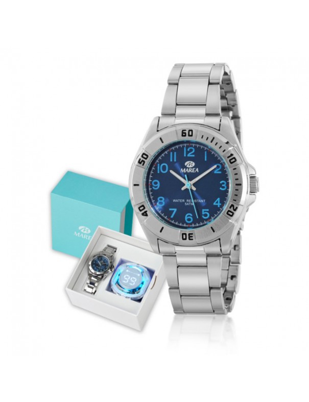 Reloj Marea Niño B41399/2. Reloj para niños con movimiento de cuarzo japonés de 3 agujas y esfera de color azul oscuro con números en tono azul claro, ofrece una lectura de la hora simple y precisa. La caja y el brazalete de acero inoxidable aportan durabilidad y confort, adaptándose al uso diario de los más pequeños. Su resistencia al agua hasta 5 ATM permite llevarlo sin preocupaciones en actividades cotidianas como lavado de manos o salpicaduras de agua. Este modelo se presenta además con auriculares Bluetooth incluidos. Garantía de 3 años.