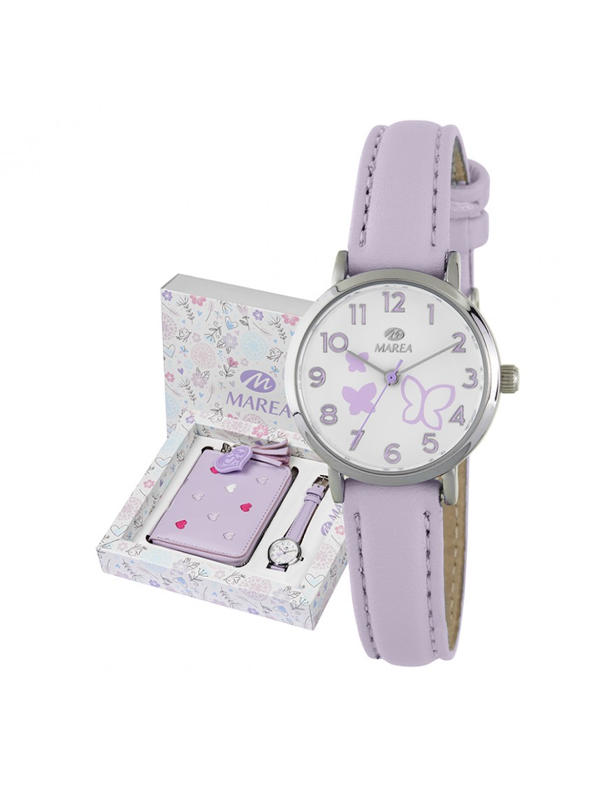 Reloj Marea Niña B41436/6. Presenta una caja de acero inoxidable de tamaño compacto con una correa de piel en color morado, aportando comodidad y un toque de color que combina con diferentes estilos. El movimiento de cuarzo analógico de 3 agujas garantiza una lectura de hora precisa y sin complicaciones, mientras que su cristal mineral protege la esfera frente a arañazos y uso cotidiano. Incluye cartera de regalo.