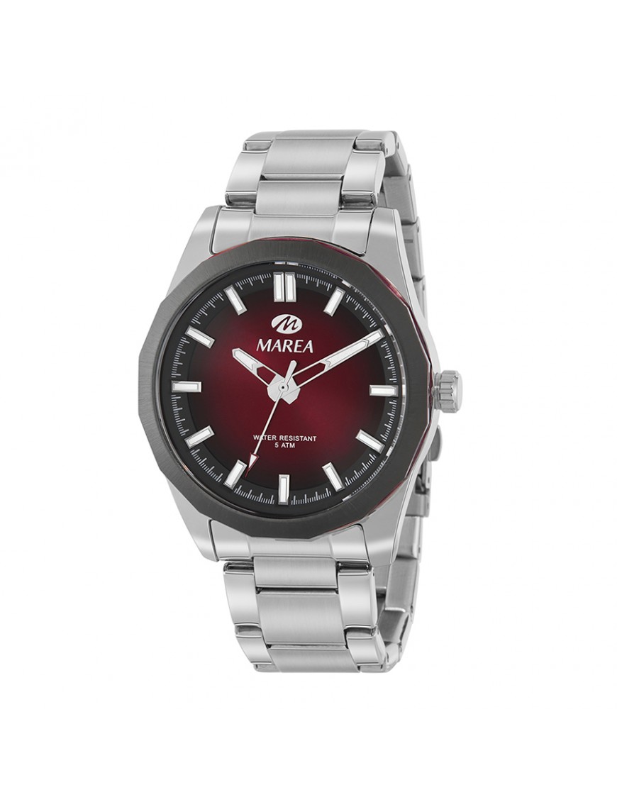 Reloj Marea Caballero Acero B54297/2. Reloj analógico para hombre con un diseño elegante y versátil, perfecto tanto para el uso diario como para ocasiones más formales. Cuenta con una caja de acero inoxidable plateado y una correa de acero que aportan un acabado sofisticado y confortable. Su esfera es un degradado de negro y rojo con índices y agujas contrastados que facilita la lectura de la hora en cualquier momento, mientras que el diseño minimalista realza su estilo clásico. Tiene una resistencia al agua de 5 ATM. Garantía de 3 años.