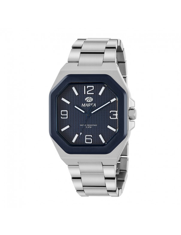 Reloj Marea Caballero Azul B54295/3. Reloj analógico para hombre que se caracteriza por un diseño elegante y funcional, ideal para quienes buscan un estilo clásico con un toque moderno. Presenta una caja octogonal y correa de acero inoxidable en tono plateado, con un acabado brillante que aporta sofisticación a cualquier conjunto. Su esfera azul con índices y agujas contrastados ofrece una lectura de la hora fácil y clara, mientras que los detalles sencillos realzan su carácter versátil para uso diario o en ocasiones especiales. Este modelo cuenta con resistencia al agua de 5 ATM, lo que lo hace apto para el uso diario y resistente a salpicaduras, lluvia o ducha sin inmersiones prolongadas.
