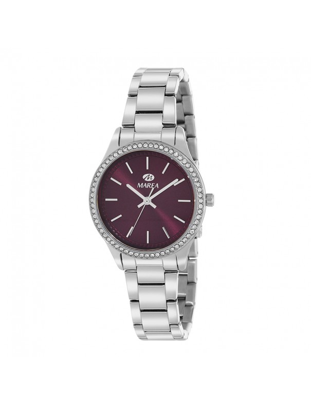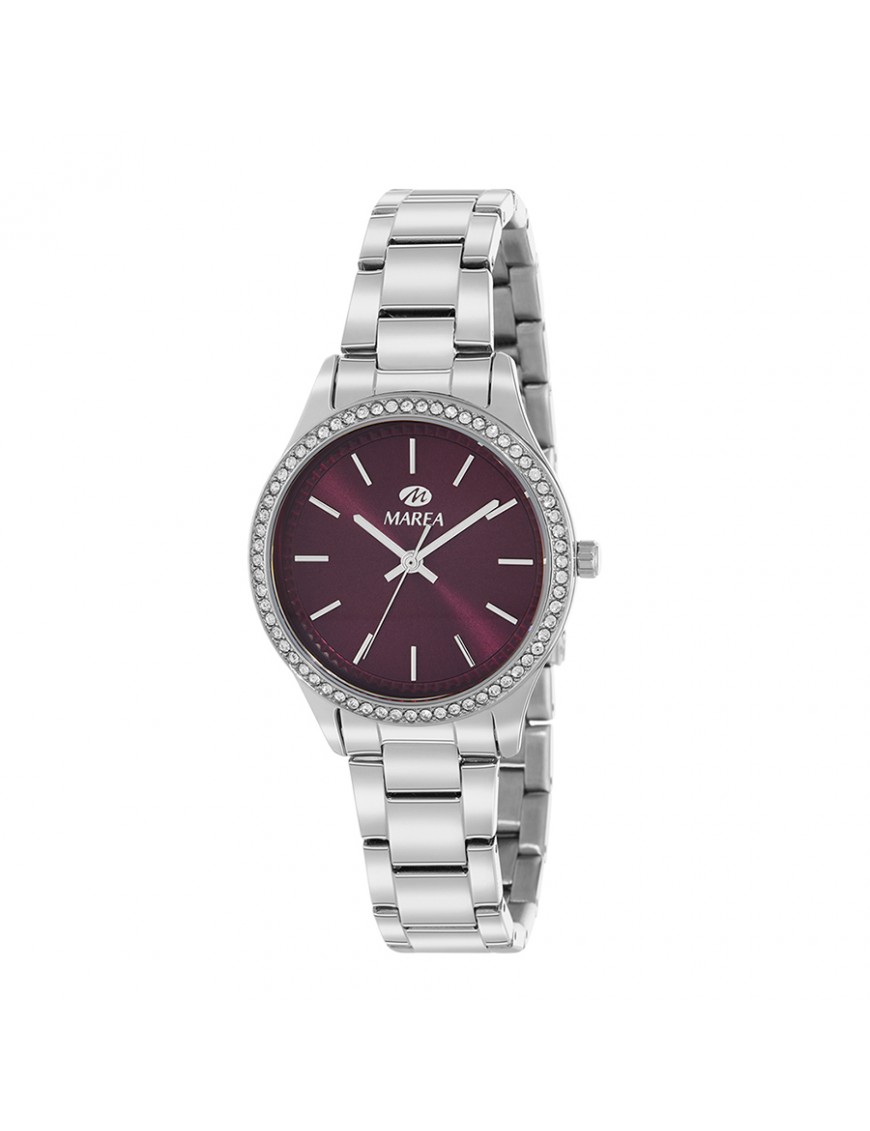 Reloj Marea Mujer Granate B54277/3. Reloj de mujer elegante y funcional con caja y correa de acero inoxidable, diámetro de caja de 34 mm y una esfera granate analógica con bisel de circonitas, ideal para uso diario y ocasiones especiales, que combina estilo moderno con una precisión fiable gracias a su movimiento de cuarzo Quartz y ofrece resistencia al agua hasta 3 ATM (30 m) que protege frente a salpicaduras cotidianas.