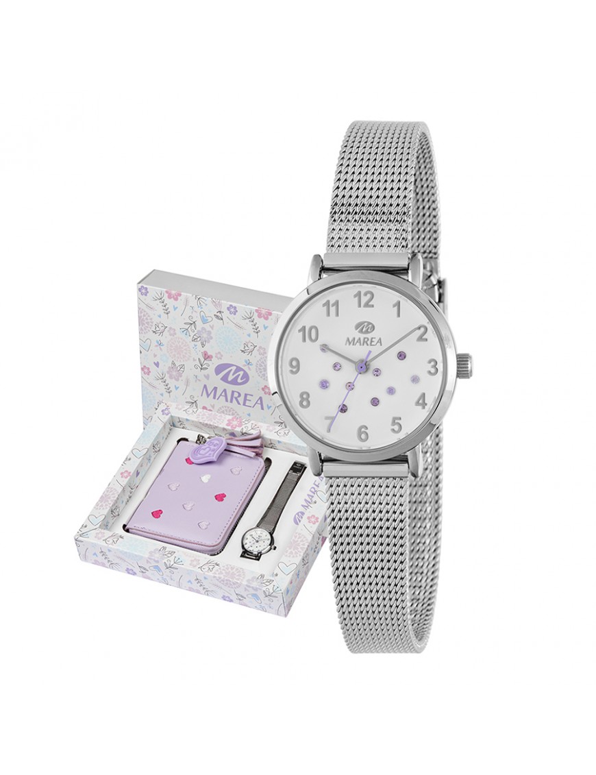 Reloj Marea Niña B41435/3. Reloj analógico juvenil con caja de acero inoxidable de 26 mm y correa de esterilla de acero con cierre oculto, diseñado para aportar estilo y comodidad a las muñecas más pequeñas, con una esfera blanca bicolor con tonos morados que da un toque alegre y moderno, movimiento cuarzo fiable y cristal mineral resistente. Incluye una cartera de regalo. Ofrece resistencia al agua hasta 3 ATM.