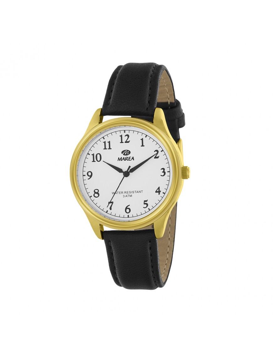 Reloj Marea Caballero B41387/5. Reloj Marea caballero con correa de piel negra, un elegante reloj analógico que combina estilo clásico y funcionalidad para el uso diario. Este modelo destaca por su diseño clásico y versátil, con caja metálica resistente en color dorado y esfera clara que facilita la lectura de la hora, aportando un toque sofisticado y atemporal a cualquier look. Incorpora movimiento de cuarzo japonés de tres agujas, conocido por su precisión y fiabilidad, lo que garantiza una medición exacta del tiempo en todo momento. Su correa de piel negra con cierre de hebilla proporciona comodidad y un ajuste seguro en la muñeca, ideal tanto para el día a día como para ocasiones especiales. Además, cuenta con cristal mineral resistente y resistencia al agua de 3 ATM, suficiente para soportar salpicaduras y el uso cotidiano.