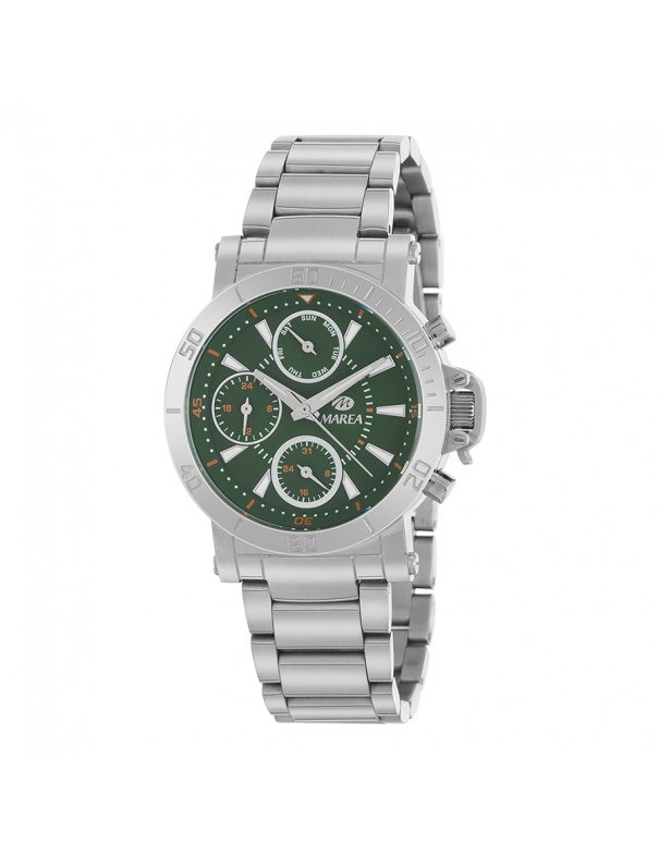 Reloj Marea Caballero B35369/2. Reloj de hombre con caja y brazalete de acero y esfera verde. Un reloj analógico diseñado para el hombre moderno que busca estilo, funcionalidad y versatilidad en un solo accesorio. Este modelo destaca por su acabado en acero inoxidable plateado, que aporta resistencia y durabilidad, combinado con una esfera verde principal con 3 subesferas integradas que ofrecen funciones adicionales, aportando sofisticación y carácter al diseño. El reloj cuenta con movimiento de cuarzo de alta precisión, garantizando exactitud en la medición del tiempo. Su cristal mineral resistente a arañazos y golpes protege la esfera y las subesferas del desgaste diario. El brazalete de acero con cierre seguro asegura un ajuste cómodo y estable en la muñeca, combinando estilo y funcionalidad.