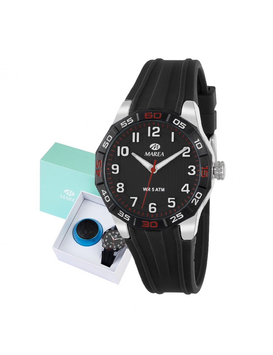 Reloj Marea Niños B35384/1. Reloj infantil de la marca Marea con diseño deportivo y moderno, ideal para el uso diario de los más pequeños. Presenta una caja de acero con acabado en negro que aporta resistencia y durabilidad, acompañada de una esfera analógica también en color negro con agujas e índices que facilitan la lectura de la hora. Su estilo sport se combina con una correa cómoda y segura pensada de silicona para la actividad diaria, mientras que el cristal mineral protege el reloj frente a pequeños golpes y arañazos. Funciona con movimiento de cuarzo, ofreciendo precisión y fiabilidad en un reloj práctico y juvenil pensado para acompañar a los niños en cualquier ocasión.