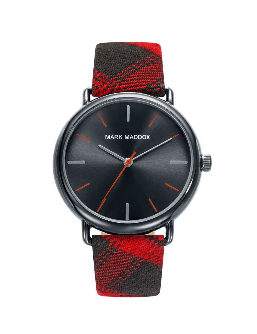 Reloj Mark Maddox Hombre HC3029-17. Esfera redonda negra. Caja que contiene el mecanismo realizada en metal bañado en color negro. correa de tela con estampado a cuadros negros y rojos. Diámetro del reloj 42 mm. Sumergible a 3 ATM. Garantía 2 años.