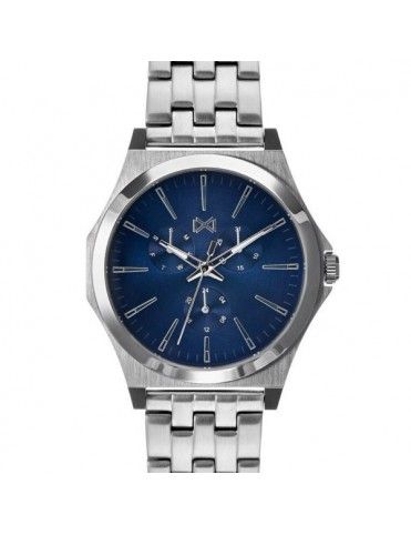 Reloj Mark Maddox hombre multifunción HM7102-37. Colección Marina. Es un reloj analógico multifunción diseñado por la firma Mark Maddox, para hombre, y está realizado en metal hipoalergénico e inoxidable, color plateado. La caja que guarda el mecanismo tiene un diámetro de 41 milímetros y es sumergible a 50 metros y sobre ella se sitúa el bisel que es liso, sin decoración. La pulsera del reloj tiene un cierre de seguridad de tipo desplegable.