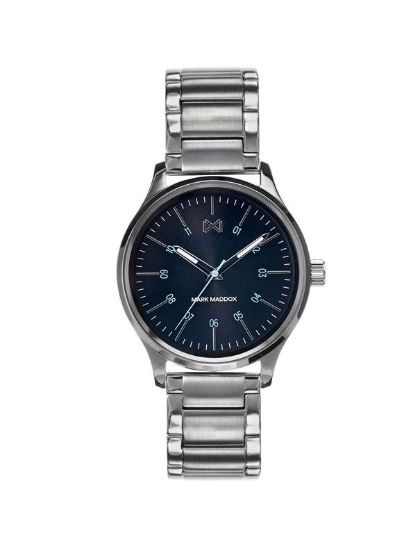 Reloj Mark Maddox hombre HM7101-57. Colección Village. Es un reloj analógico tres agujas diseñado por la firma Mark Maddox, para hombre, y está realizado en metal hipoalergénico e inoxidable, color plateado. La caja que guarda el mecanismo tiene un diámetro de 41 milímetros y es sumergible a 50 metros y sobre ella se sitúa el bisel que es liso, sin decoración. La pulsera del reloj tiene un cierre de seguridad de tipo desplegable con pulsadores.