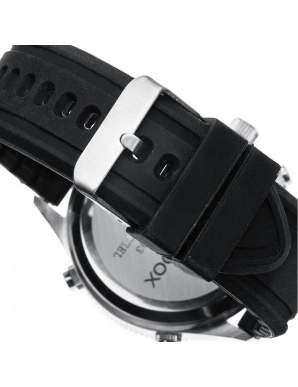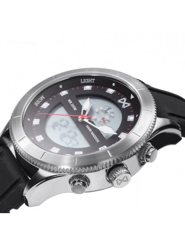 Reloj Mark Maddox Hombre HM1003-57 Mission. Es un modelo analógico digital. La caja es de acero en color plata. La correa en caucho negra. Entre sus funciones: Calendario, Cronógrafo, indicador del día de la semana y luz trasera. El tamaño de la caja es de 45 milímetros y es sumergible a 100 metros de profundidad. Un cristal mineral cubre la esfera la cual es de color gris.