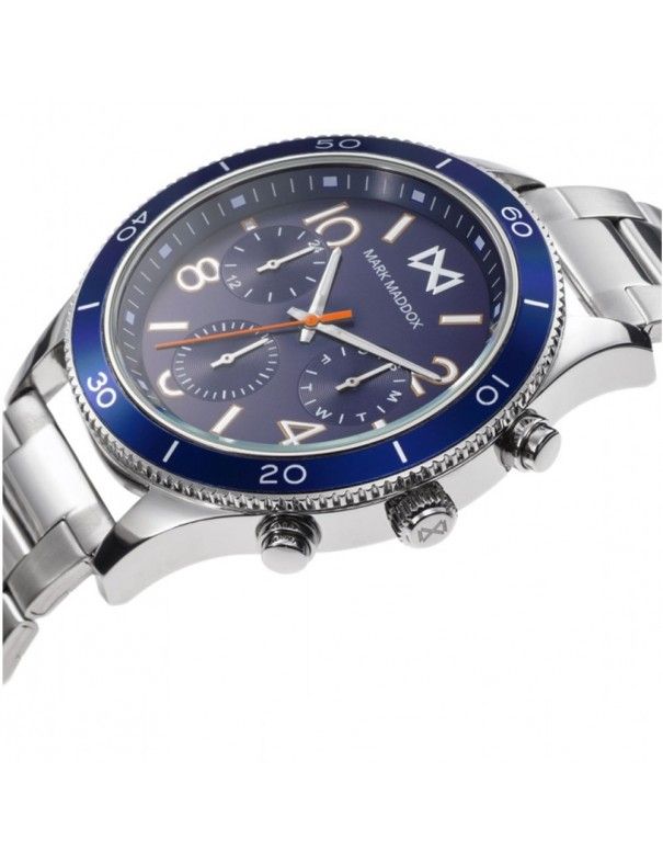 Reloj Mark Maddox hombre multifunción HM7136-34. Es un reloj analógico multifunción diseñado por la firma Mark Maddox, para hombre, y está realizado en metal hipoalergénico e inoxidable, color plata. La caja que guarda el mecanismo tiene un diámetro de 43 milímetros y es sumergible a 50 metros y sobre ella se sitúa el bisel con numeración grabada. La pulsera del reloj tiene un cierre de seguridad de tipo desplegable.