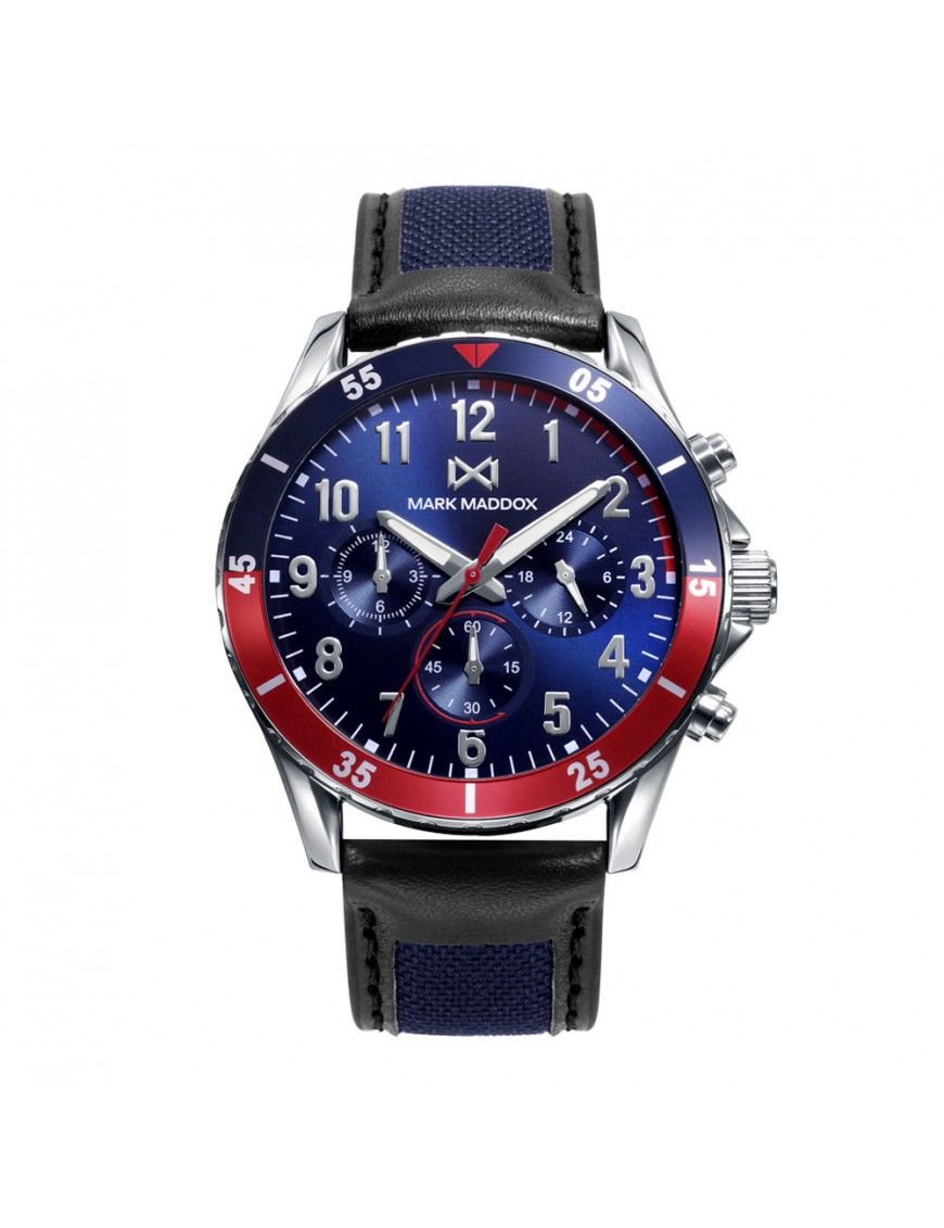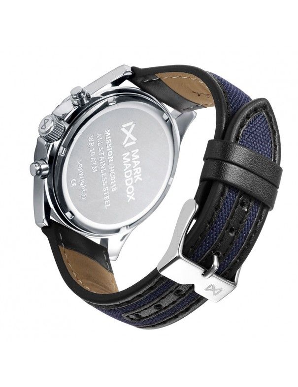 Reloj Mark Maddox Hombre HC0118-35 Mission, cronógrafo multifunción. Caja de acero de 44mm de diámetro. Agujas luminiscentes. Bisel bicolor. Pulsera de piel negra y naylon azul. Cristal mineral. Sumergible a 10ATM, por lo que es apto para ducha y baño con inmersión.