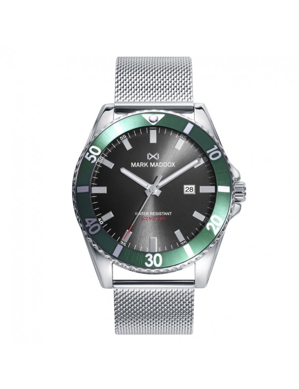 Reloj Mark Maddox para hombre HM0139-57. La esfera es de acero y mide 43 mm de diámetro. La pulsera es del mismo material y lleva cierre deslizante ajustable. Es sumergible a 20 ATM y permite el buceo con botella. Garantía de tres años.