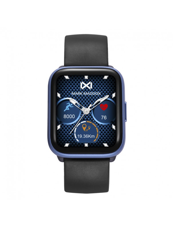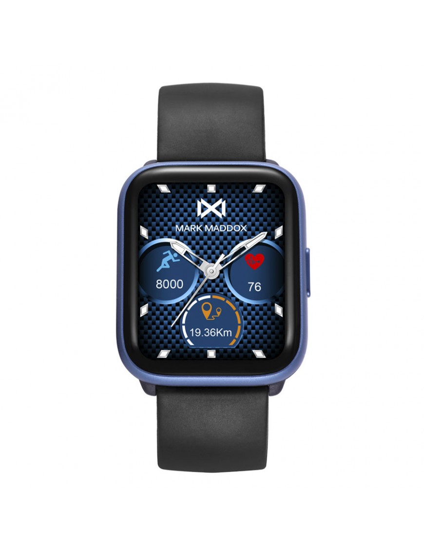 Reloj Mark Maddox Smart unisex HS0004-30. La caja es de aluminio y mide 35 mm de ancho. La pulsera es de silicona con hebilla. Incluye funciones smart como aviso de llamadas y notificaciones de aplicaciones, podómetro, pulsómetro, cuenta calorías, medición de presión arterial, funciones deportivas y crono entre otras. No es sumergible (IP68) y sólo admite la inmersión a 1,5 metros durante un máximo de 1 hora. Garantía de tres años.