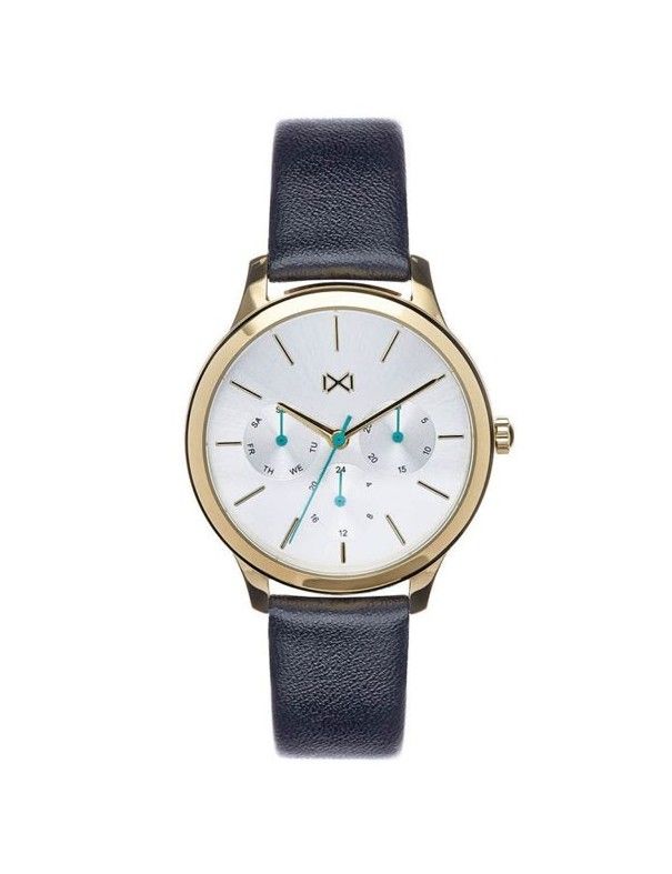 Reloj Mark Maddox Mujer multifunción MC7103-07. Es un reloj diseñado por la marca Mark Maddox, para mujer colección Village. Es un modelo analógico multifunción de tres agujas con movimiento de cuarzo alimentado con pila. Tiene tres esferas que indican el dia del mes y de la semana. La caja que contiene al mecanismo es de metal antialérgico, bañado en oro, mide 36 milímetros de diámetro y es sumergible a 50 metros 5 ATM. El cristal es de alta resistencia para proteger la esfera de color blanco. Los marcadores de la hora son índices. la agujas de horas y minutos son dorados y el segundero azul turquesa. Por otro lado, la correa es de piel negro con cierre en hebilla. Los relojes Mark Maddox cuentan con una garantía de 2 años contra cualquier defecto de fabricación.