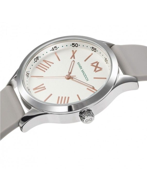 Reloj Mark Maddox mujer Tooting MC7115-03. Colección Tooting. Es un reloj analógico. La pulsera del reloj en silicona de color gris con cierre terminado en hebilla. Un cristal resistente protege a la esfera, la cual, es de color blanca. Los marcadores horarios y agujas en oro rosa estas últimas luminiscentes.