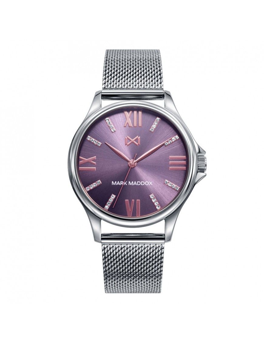 Reloj Mark Maddox Mujer MM7146-73 Tooting, analógico con segundero. Esfera morada de 36mm de diámetro con ocho indicadores decorados con circonitas. Pulsera milanesa de acero. Cristal mineral. Sumergible a 5ATM, por lo que es apto para ducha y baño sin inmersión.