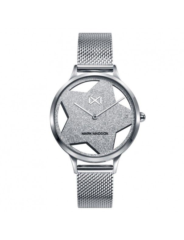 Reloj Mark Maddox Mujer Tooting MM7150-00, analógico sin segundero. Esfera de 35mm de diámetro con forma de estrella en el interio. Pulsera milanesa de acero. Cristal mineral.