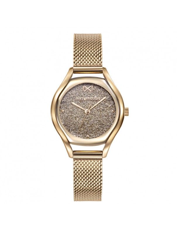 Reloj Mark Maddox Mujer Venice MM0124-97, analógico con segundero. Esfera de 30mm de diámetro, decorada con cristales en su interior. Pulsera milanesa de acero en color dorado. Sumergible a 3ATM, por lo que sólo soporta pequeñas salpicaduras.