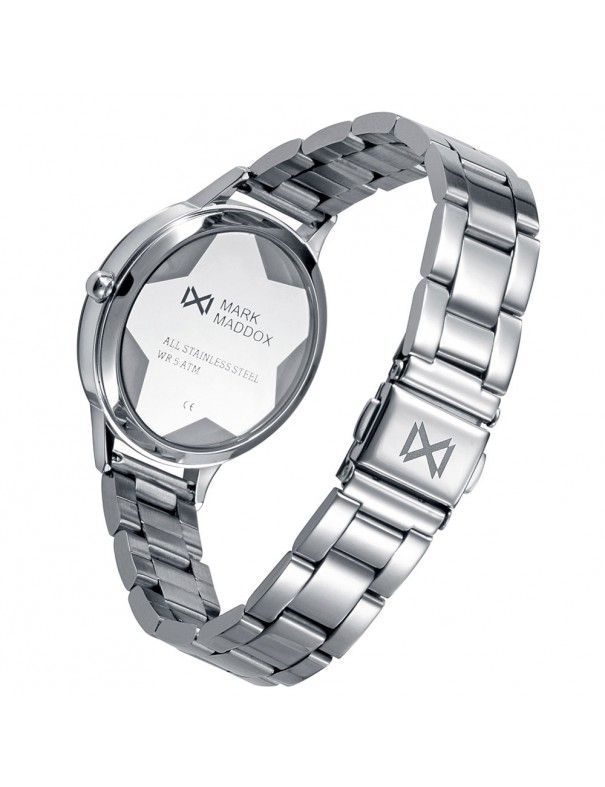 Reloj Mark Maddox Mujer Tooting MM7149-30, analógico sin segundero. Esfera de 35mm de diámetro con forma de estrella en su interior. Pulsera milanesa de acero. Cristal mineral. Sumergible a 5ATM, por lo que es apto para ducha y baño sin inmersión.