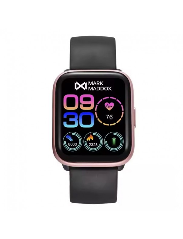 Reloj Mark Maddox smart HS0004-70. La esfera es de aluminio y mide 35 mm de ancho. La pulsera es de silicona con hebilla. Incluye funciones smart como aviso de llamadas, notificaciones de aplicaciones, podómetro, pulsómetro, medición de presión arterial, cuenta calorías y funciones deportivas entre otras.
