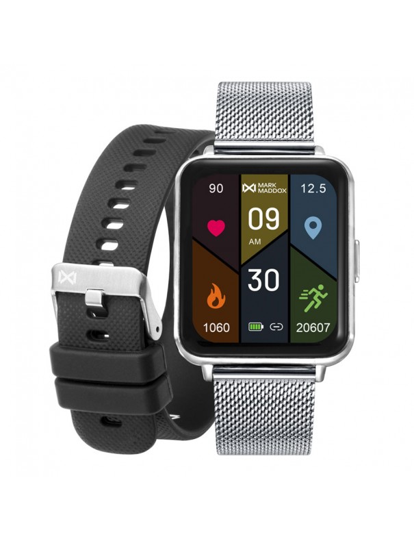 Reloj Mark Maddox Smart HS1002-00. La esfera es de aluminio y mide 36 mm de ancho. La pulsera es de acero con cierre deslizante más otra adicional de silicona con hebilla. Incluye funciones smart como respuesta a llamadas, notificaciones de aplicaciones, pulsómetro, podómetro, funciones de salud y deportivas entre otras.