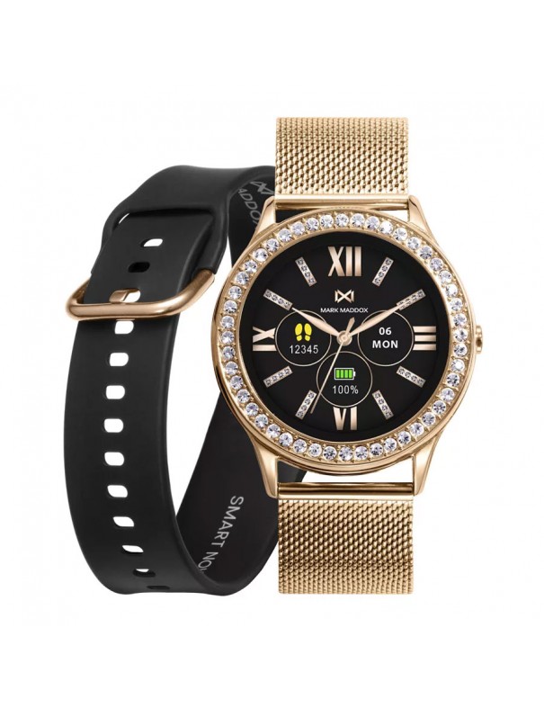 Reloj Mark Maddox Smart para mujer MS1002-90. La esfera es de acero y aluminio y mide 40 mm de diámetro. La pulsera es de acero y lleva otra adicional de silicona con hebilla. Incluye funciones smart como aviso de llamadas y notificaciones de aplicaciones, pulsómetro, podómetro, funciones de salud y deportivas entre otras. No es sumergible (IP68) y sólo permite la inmersión ocasional a 1,5 metros durante un máximo de una hora. Garantía de tres años.