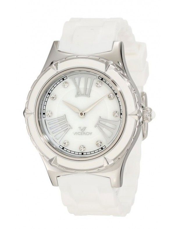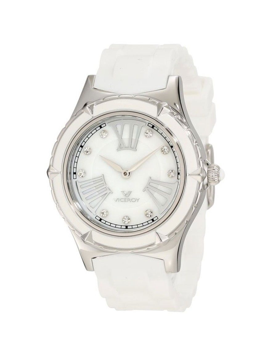 Reloj Viceroy mujer 432104-03. Reloj analógico con la correa realizada en goma blanca, y con la caja que contiene el mecanismo elaborada en acero hipoalergénico. La caja tiene un diámetro de 38mm. La esfera del reloj es de color blanca y está decorada con circonitas. El reloj es sumergible a 5 ATM, y cuenta con 2 años de garantía.