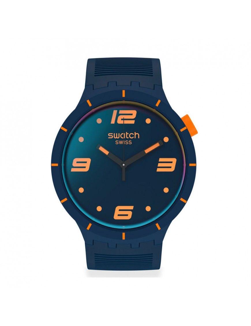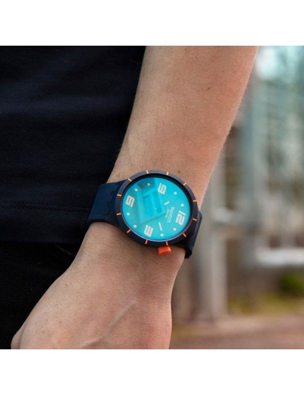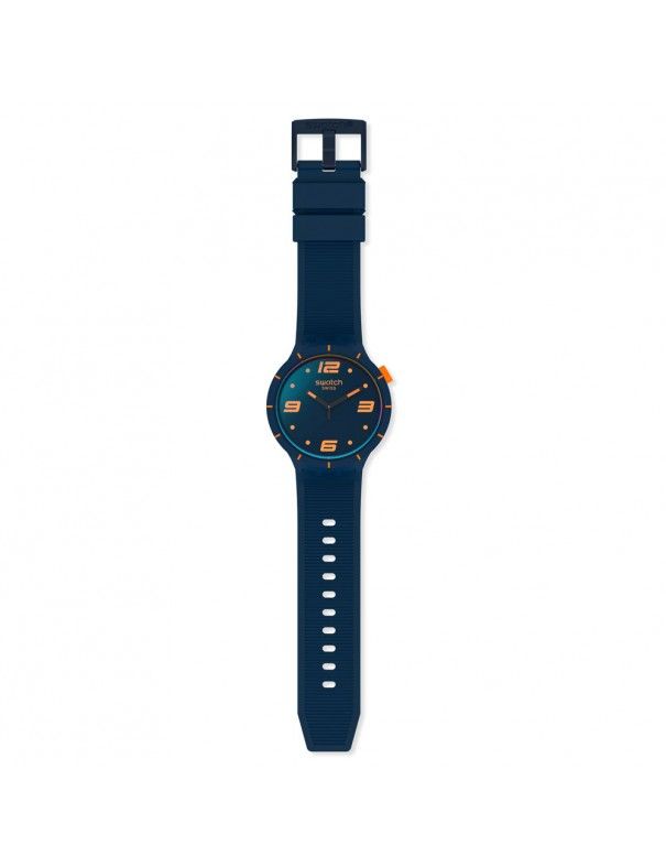 Reloj Swatch Futuristic Blue SO27N110 Hombre, analógico con segundero. Caja de plástico de 47mm de diámetro y pulsera de caucho azul oscuro. Agujas luminiscentes. Sumergible a 3ATM, por lo que sólo soporta pequeñas salpicaduras.